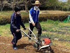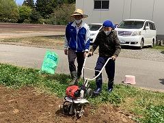栽培する夏野菜が決まったら農園へ行き、耕運機を使って畑を耕し、栽培に向けて準備をしました。