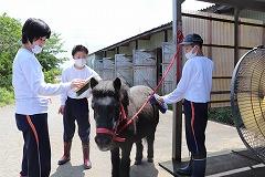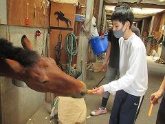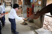 にんじんを食べようと顔を近づけてくる馬が怖くて、手を引っ込めてしまう生徒も何人もいましたが、上手に一人であげられるようになった生徒もいました。