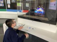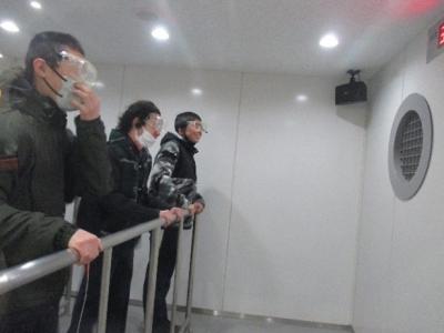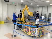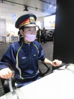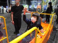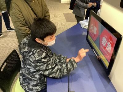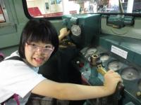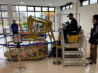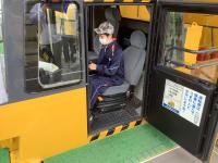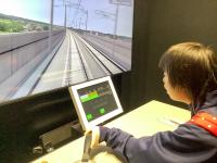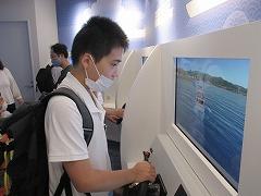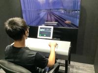 大型運転シミュレータでの運転体験では、画面を見ながらレバーを動かして運転手気分を味わいました。