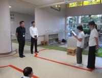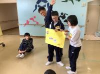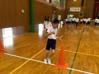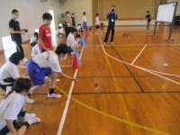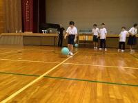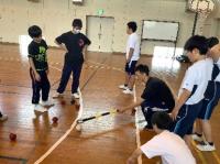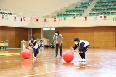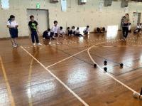次に体育館に移動し、ボッチャを行いました。ジャックボール(白玉)めがけて自分のチームの赤玉や青玉を転がし、競い合いました。得点の数え方もみんなで確認しながら数えました。