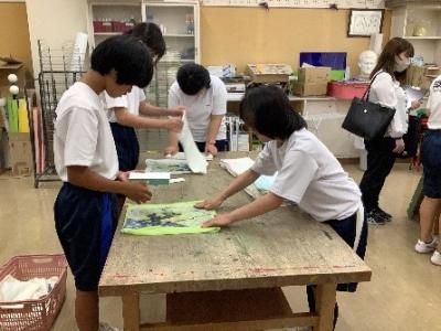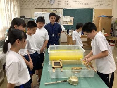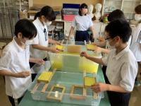 作業では、本校の生徒がどの様に行うか作業手順を説明し、山中中学校の生徒のみなさんが紙すきや紙綿詰めを