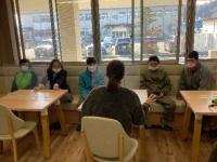 橋立海青学園、山中中学校、山代中学校、片山津中学校の4校の生徒が合同授業で来校し、一緒に作業学習(紙すき・