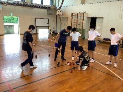 次に体育館に移動し、ボッチャを行いました。ジャックボール(白玉)めがけて自分のチームの赤玉や青玉を