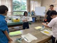 4グループに分かれて自己紹介の後、作業体験(紙すき、水分取り、紙わた詰め)を行いました。