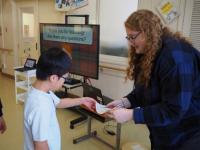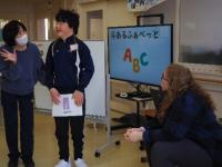 12月16日(火)に国際交流を行いました。大聖寺高校からALTのSamantha先生をお迎えしての交流会でした。まずは、練習した「Hello」の挨拶をしました。みんな張り切って大きな声で挨拶ができました。自己紹介をお互いにした後、Samantha先生の誕生日が近いと言う事が分かり急遽、歌のプレゼントをして、とても喜んでもらえました。好きな食べ物やキャラクターについて質問したり、名前カードを交換したりしました。自分と同じものが好きなことが分かって喜ぶ児童や、緊張しながらも一生懸命関わろうとする児童の姿が見られました。