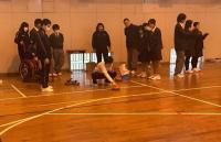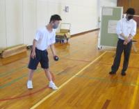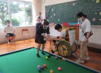 前半は錦城特別支援学校が中心となり、合同グループでフロアカーリングとアキュラシーを行いました。生徒が投げ方を