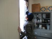 グループで校内をまわり、スクイージーを使った窓清掃や紙すきの材料となる牛乳パックのラベルはがし、