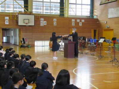 続いて吹奏楽部の演奏を全校で聞きました。一つ一つの音色、楽器の音がしっかりしていて、それが全体としてきれいに重なって響き合っている演奏でレベルの高さに驚きました。小学生でここまでできるのかと感心しました。