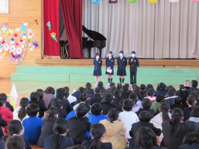 校長からは、1年間を振り返り、新たな目標を見つけて新しい学年に進むことの大切さについて、生徒指導からは春休みの安全についての話がありました。