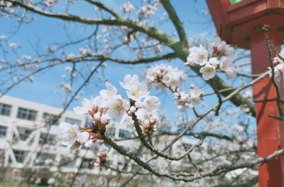 学校では、桜の花と1年生のチューリップがきれいに咲いています。