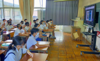 7月13日(火)講堂にて、1年生の「交通安全教室」が行われました。大聖寺警察署からお巡りさんが来て下さり、身の回りに潜んでいる危険について、クイズを交えて楽しく考えることのできるアニメーションを見せていただきました。