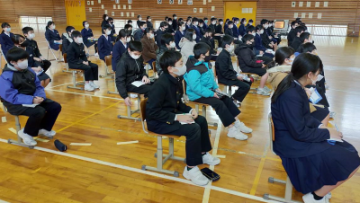 1月26日(火)今日は、1.2年生対象に、「防犯教室」が行われました。大聖寺警察署から警察官の方に来ていただき、不審者等から身を守る方法についてお話を聞きました。