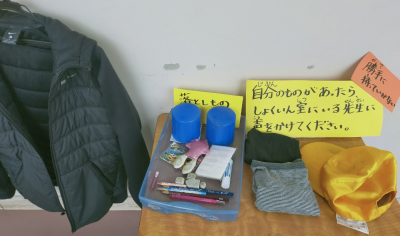 職員室前の廊下に、机が一つあります。その上には、鉛筆や消しゴム、安全帽子やシャツ、NIKEのSサイズのジャンパーなどいろいろな落とし物が置かれています。