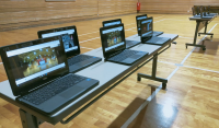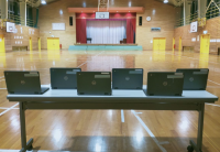 学校の体育館には、写真の様に12クラス分のクロムブックが12台並んでいます。皆さんは、各クラスのクラスルームからMeetに参加している状況です。