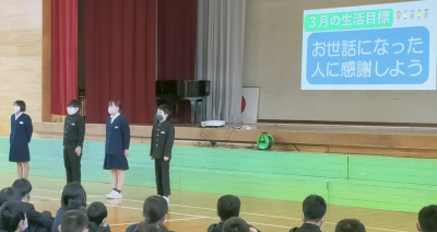 2月24日(水)今日は、気温が低かったものの、良く晴れ上がり気持ちのいい朝でした。朝は全校朝会を行い、企画委員会が、3月の「お世話になった人に感謝しよう」という生活目標に向けて、手紙を書く提案を行いました。