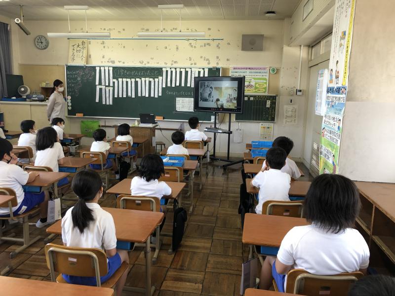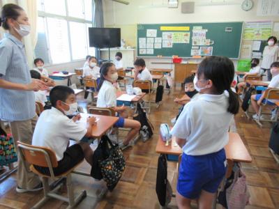前日までの大雨が嘘のような晴天となった今日、全校登校日がありました。全学年がそろうのは7月20日の終業式以来です。全校集会で夏休み中の過ごし方について話を聞き、そのあとは児童会が平和について考えるための朗読をしてくれました。原爆のせいで亡くなった渡辺貞子さんの願いが日本の子どもたちから、世界の子どもたちに広がっていくというお話でした。いま世界では大きな戦争が行われています。どちらの国からも犠牲者が出て、子どもたちもたくさん亡くなっています。77年前の悲劇をしっかり子どもたちに伝えていくことの大切さを強く感じる今です。
