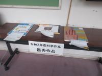 職員室前に昨年度の科学作品展の優秀作品が展示されています。「植物が好きな色はあるのかな?」「野菜や果物ででんちはできるのかな?」「お湯の温度が違うと手のふやけ方は違うのかな?」ふとした疑問や興味を持ったことを追求するのが科学作品です。
