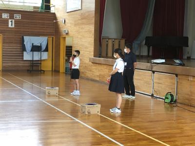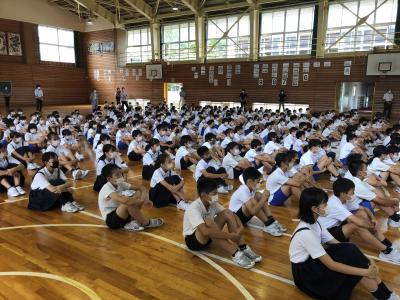 1学期の修了式を行いました。校長からは、自分で何か一つ目標を立ててやり遂げることで、自分を成長させ自信をつけてほしいという話をしました。続いて生徒指導からは自分の命を守るために気を付けてほしいことの話がありました。夏休みは楽しいこともいっぱいですが、危険もいっぱいです。交通事故、不審者、水の事故、家事や熱中症に気を付けて安全第一で過ごしてほしいと思います。最後に運動会の色決めがありました。かっくくみの団長がくじを引き、今年は1組が赤、2組が白となりました。運動会での応援合戦や競技が今から楽しみです。