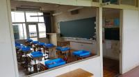 錦城小学校では、5月中一人4回の登校について、できる限りクラス単位で授業を行いたいと考え、学年別登校の形式を取り入れました。教室内のロッカーなどを廊下に出すことで、市の基準である、教室内1~2mの確保が可能であり、廊下の窓を外すことで開放的な空間になっています。手洗い場も、写真のように間隔を開けて待つように指導します。