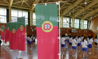 7月16日(金)本来ならば、ポルトガル選手団との交流事業が行われる予定でしたが、コロナの影響もあり、学校の講堂でDVD撮影を行い、選手団に渡すことになりました。