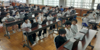 錦城小学校での、パソコンの授業を見学させて欲しいとのことで、3限目に4年1組「国語」6年1組「算数」6年2組「英語」の授業で、クロムブックを使っている様子を見ていただきました。