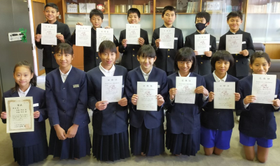 今日は、「第15回いしかわっ子駅伝」と「一筆啓上 親子の手紙」の表彰式、および、11月の生活目標の振り返りを行いました。体育館では写真を撮ることが出来なかったので、1限後に校長室にて、表彰者全員で写真を撮りました。