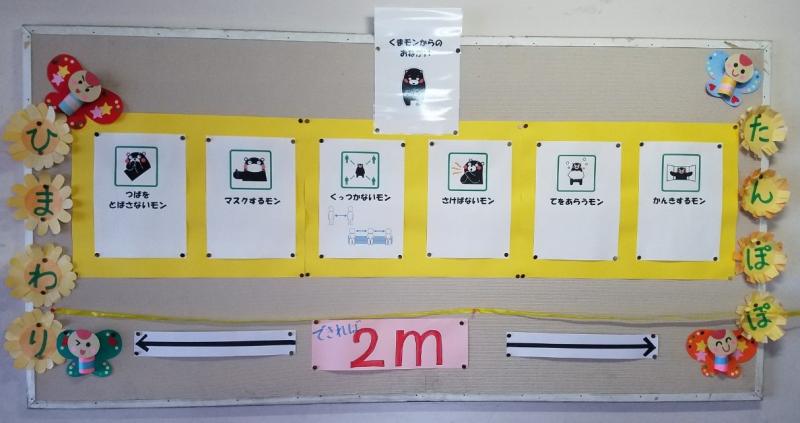 ひまわり、たんぽぽ教室の前には、上のような「くまもん」がいろいろとコロナについて注意してくれています。これからはプール授業やクラブ活動など、新たな活動も増えていきます。油断せず、そして恐れすぎず学校運営を行っていきたいと思います。
