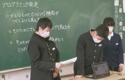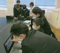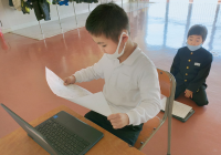 3月11日(木)1年生の教室をのぞいてみると、一人1台のパソコンに向かい、何やらしゃべっています。何をしているのかな?と見ていたら、どうやら、自分で書いた作文を発表する練習をしていたようです。