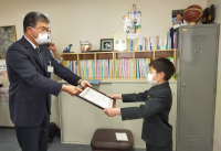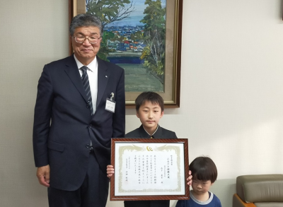 先日、4年生の山下さんが、加賀市で10人目の「ふるさと探検大使」となり、教育委員会の教育長室で表彰式が行われました。教育長から、立派な表彰状が贈られました。
