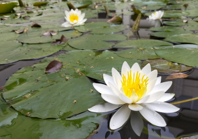 毎年梅雨の季節になると、池の睡蓮がきれいな花を咲かせます。不思議なことに、午前中のみ咲いて、午後になるとすぼんでしまいます。そしてたくさんの白い花の中に、1輪だけ色の違う花が咲きます。