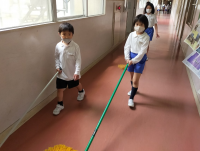 まずは、校内のどこが自分の掃除場所かを知るために、6年生が事前に1年教室に向かい、掃除場所まで手をつないで案内してくれました。とても微笑ましい光景でした。