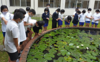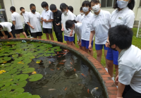 学校の中庭には、小さな錦鯉が泳いでおり、飼育・園芸委員会の子ども達が餌やりなどを担当しています。池に近づくと、たくさんの鯉が餌を求めて集まってきます。委員会が企画した「餌やり体験」も、この後あるようです。