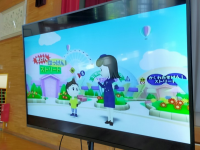 撮影は加賀市教育委員会スポーツ課のみなさんが行ってくれました。6年生は、三木小学校の6年生7人と共に、日本の遊び「こま回し」「お手玉」「けん玉」や「なわとび」などを紹介し、全員で「高砂」を謡って歓迎しました。