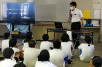 7月13日(火)講堂にて、1年生の「交通安全教室」が行われました。大聖寺警察署からお巡りさんが来て下さり、身の回りに潜んでいる危険について、クイズを交えて楽しく考えることのできるアニメーションを見せていただきました。