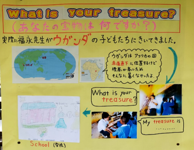 外国語活動の教室に、福永先生が何年か前に「ウガンダ」へ研修に行ったときの掲示物が貼ってありました。