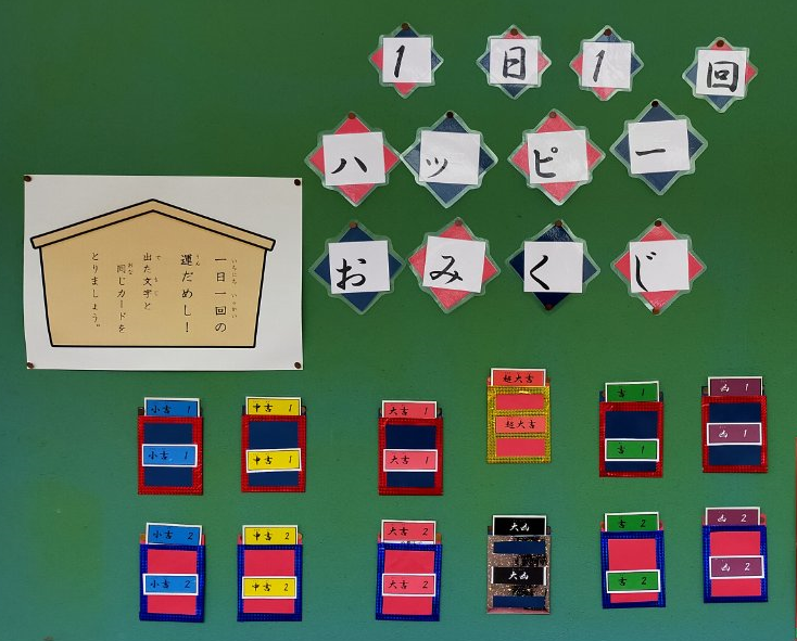 保健室の廊下には、「ハッピーおみくじ」が飾られています。1日1回引けるそうなので、その日の運試しに引いてみるのも良いですね。今日引いてみたところ、運勢は「大吉」でした。何か楽しいことがありそうです。