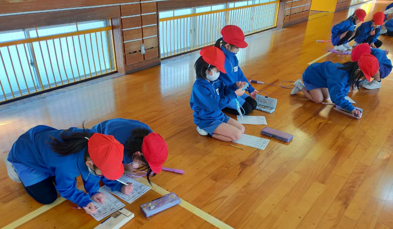 学校では、昨日「校内書き初め大会」が行われ、審査の結果、各クラスから2~3名ずつが学校代表となりました。今日はしばらくの時間でしたが、市に出品する書き初めの練習と清書を行いました。会議室に3年生以上の代表者が集まり、一斉に練習と清書を行いましたが、ピーンと緊張した雰囲気の中、みんな集中して作品を仕上げていました。