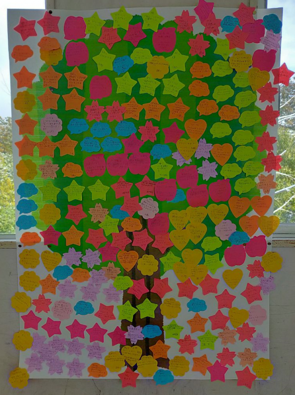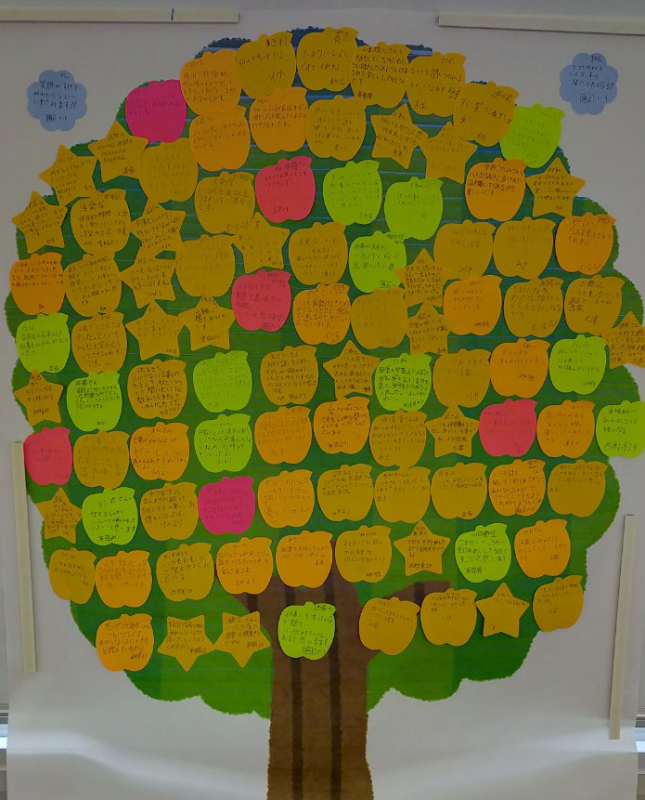 1月の生活目標は、「自分や友だちの良いところを知ろう」です。学校を回っていると、6年教室前の廊下に、写真の様なカラフルな「木」が掲示されていました。
