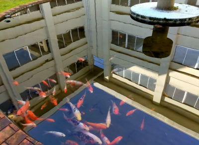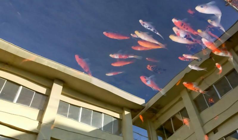 中庭の池には、たくさんの錦鯉が泳いでいます。今日は晴れて穏やかな天気でしたので、ちょっとのぞいてみると、まるで空を飛んでいるかのようでした。睡蓮の花や葉っぱも、今は池の中でじっと耐えています。