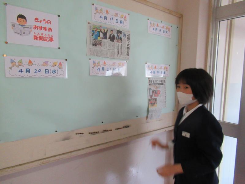 図書室から行動に向かう少し薄暗い廊下に新聞記事が掲示されています。前から誰が張っているのか気になっていたのですが、今日、長休みに図書室に行くと、新聞を切り抜いている子がいました。「図書委員会ですか?」「廊下に張るの?」と聞くと「はい」と大きく頷いていました。