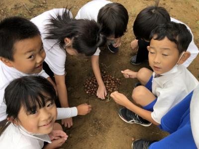 数日間にわたって運動場の片隅に2年生がたくさん集まっていました。ある子がそばに来て「先生来て。」と言うので行ってみるとたくさんのドングリを集めて地面に埋めていました。穴を掘ったりドングリを集めたりして楽しんでいたようです。きっと子供なりに楽しさや達成感があるのかもしれませんね。