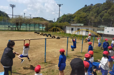 4月19日(月)1階のホールから外を見ていたら、2年生が元気よく小運動場で体育の授業をしていました。タイヤ跳びや鉄棒など、どの子も笑顔で楽しそうに活動していて、見ているこちらも元気が出てきました。