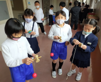 校長室横の廊下には、昔遊びの道具(けん玉、お手玉、コマ、だるま落とし)が置いてあります。長休みや昼休みには、たくさんの子ども達がやってきて、いろんな技に挑戦しています。