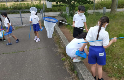 朝学校前に立っていると、虫あみや虫かごを持った子ども達がたくさんやってきました。生活科などの授業で、虫探しをするそうです。