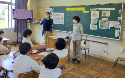 昔の人に比べ、現代は食べ物が軟らかくなってきており、かむ回数もびっくりするくらい減ってきているようです。そんな話を4年生の教室で、西野養護教諭と西田栄養教諭の二人が教えてくれました。