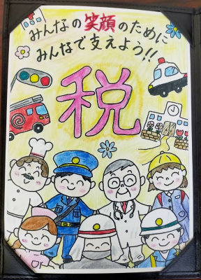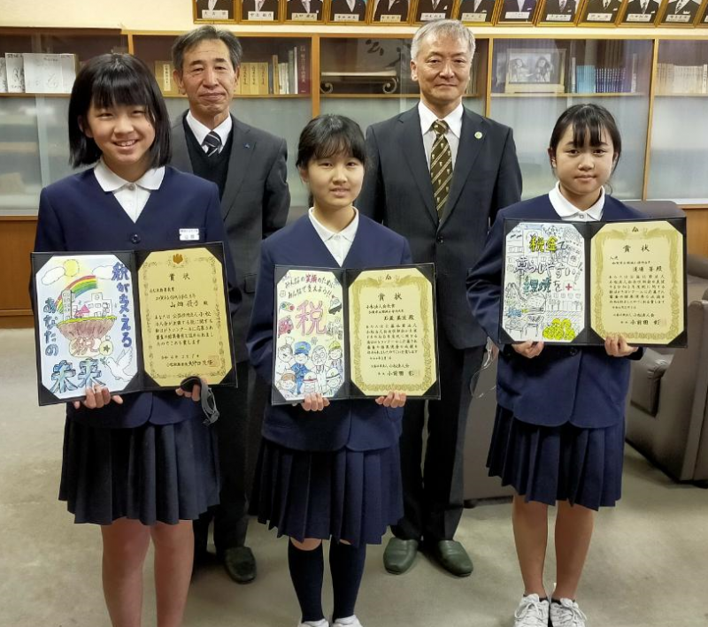 今日は、小松税務署から署長さん、そして小松法人会の方々が来られ、「税に関する絵はがきコンクール」に入賞した3名に、直接賞状を渡して下さいました。たくさんの応募があった中、錦城小学校からは、昨年に引き続き最高賞を含めた素晴らしい賞の受賞となりました。どの作品も、しっかりと丁寧に書かれていて素晴らしい作品ですね。みなさん、おめでとうございます。