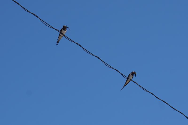 つばめを見つけました。よく見ると、つばめの口にはトンボが。つばめは、餌をくわえて巣に戻るのかな。
