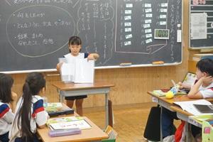 3年生は、いま地域を調べています。「金明のいいところは?」「金明の有名なところは?」という問いに、児童は「梨」「金明竹」などと答えます。それ以外に何かないかな?