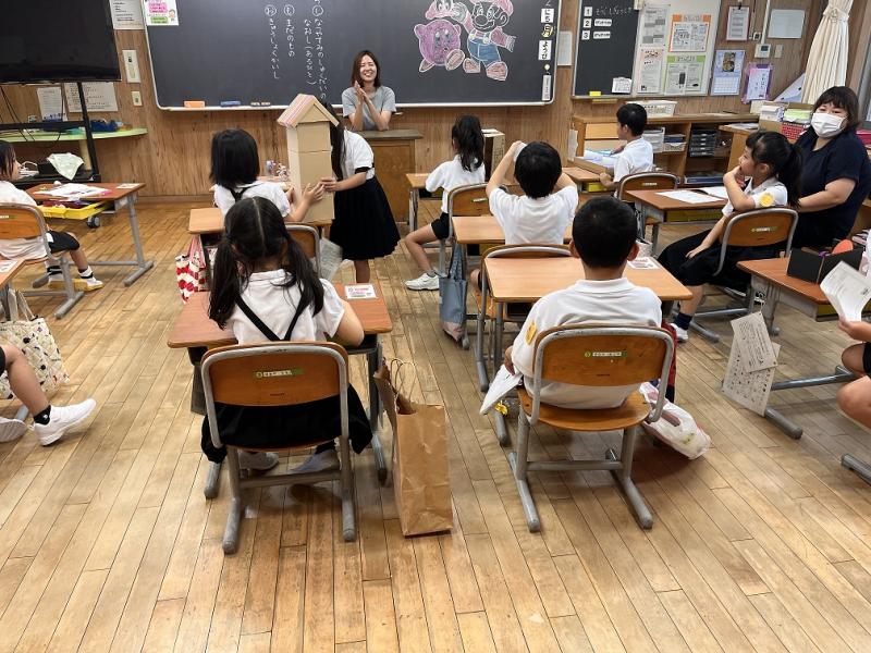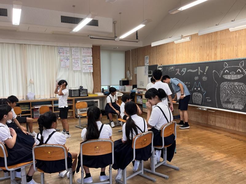 1年生の生活科では、学習課題「なつのあそびをたのしもう」で、シャボン玉を作って空に飛ばしたり、水鉄砲で水を飛ばしたりしました。外で思いっきり走り、水をかけあった1年生は、最後にこの遊びで気づいたことを振り返りました。