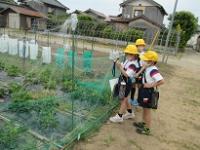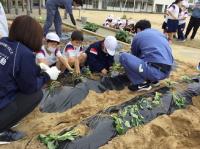 子ども達は、苗を1本1本丁寧に置き その上にやさしく土をかけながら「大きく育ってね」とお願いしていました。秋の収穫が楽しみです!